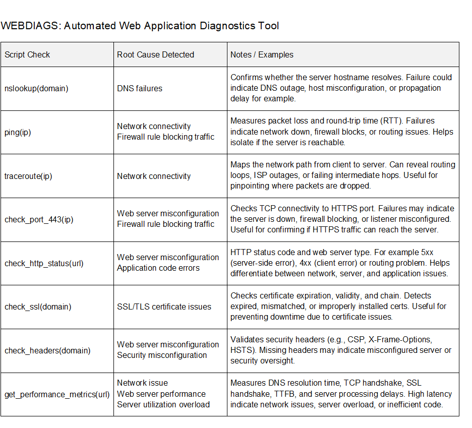 WebDiags a lightweight diagnostic tool for software developers, DevOps, and network engineers. It automates troubleshooting tasks and generates a summary HTML report shareable via email. By running a suite of automated tests, this streamlines root cause analysis and enables troubleshooting collaboration across IT teams. There is a Linux version and Windows 10/11 version available for download.