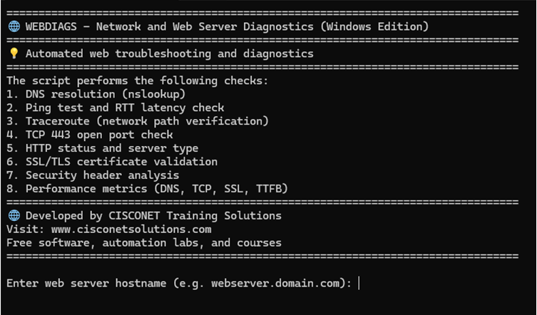 This diagnostic test prompts the user for web server hostname and attempts to resolve it to an IP address. The nslookup command is used to query DNS records based on the provided domain name. Select the first authoritative or non-authoritative answer (IP address) to use for ping test.